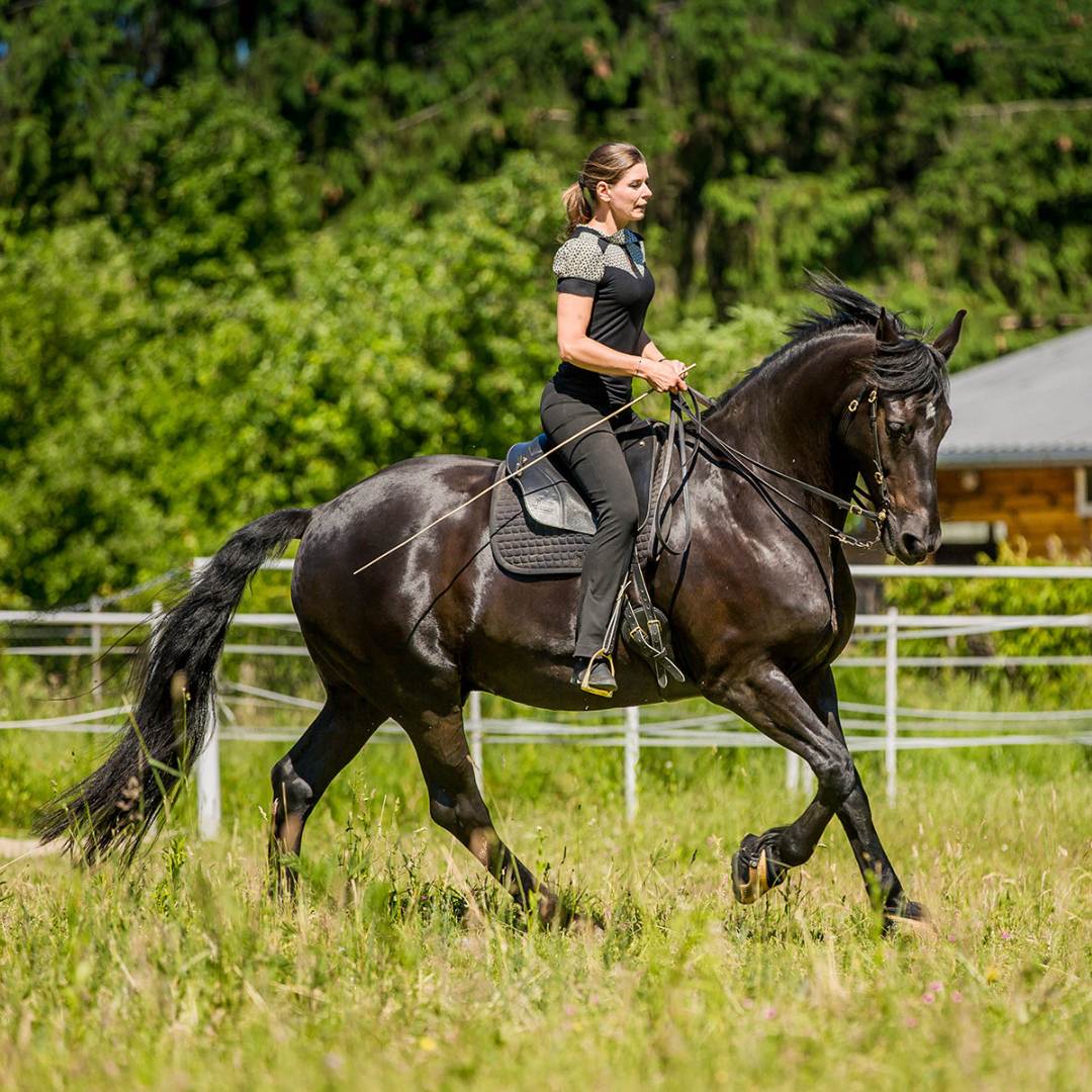 Gymnastics with a purpose. We use progressive exercises to develop strength, mobility, and self-carriage - always protecting the horse's well-being and motivation.