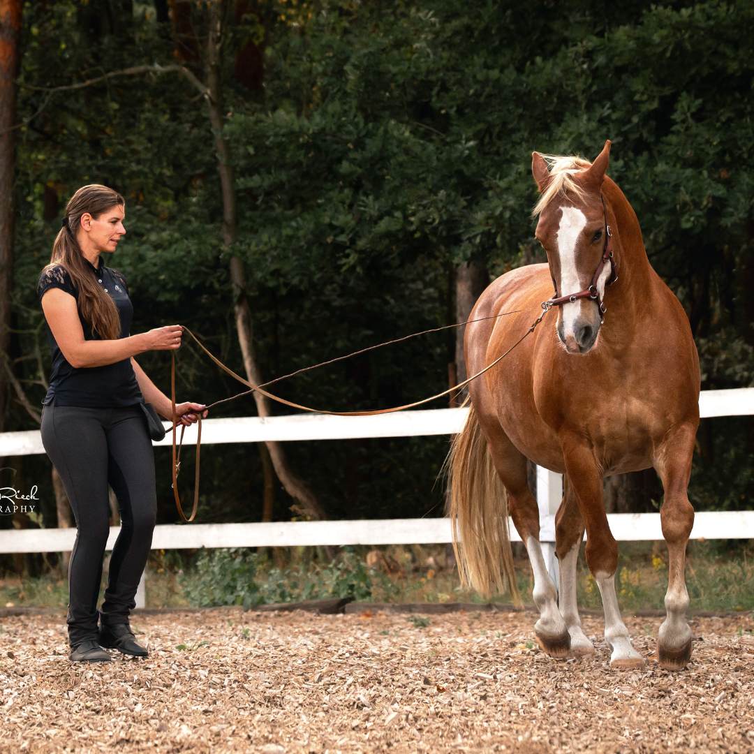 This is where you and your horse learn the basic (and later advanced) dressage exercises from the ground. You'll work through bending, circles, shoulder-in and quarter-in, and learn how to teach the groundwork aids with clarity — then progress toward more advanced work like half-pass, pirouette, and collection over time.